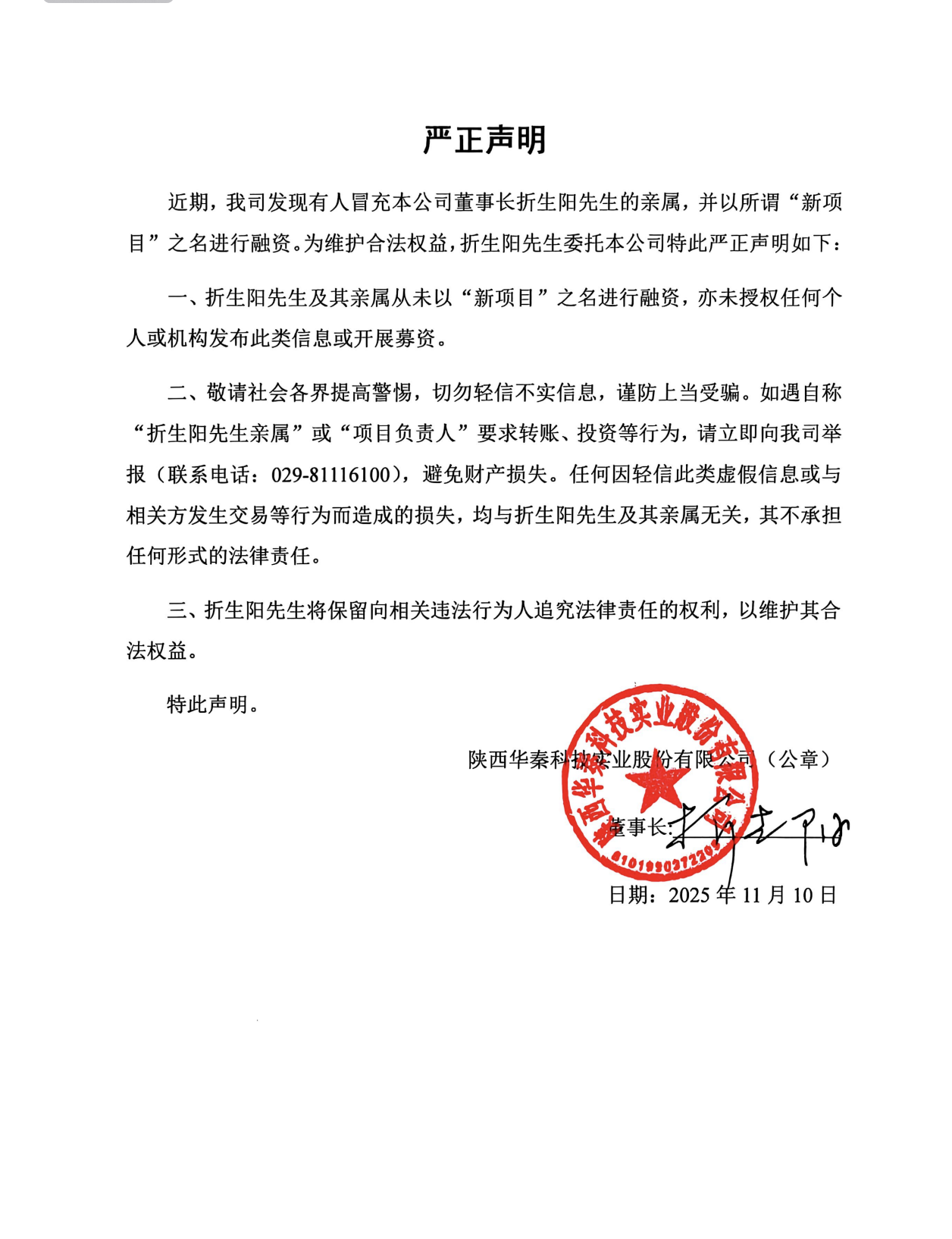 二、敬请社会各界提高警惕,切勿轻信不实信息,谨防上当受骗。如遇自称“折生阳先生亲属”或“项目负责人”要求转账、投资等行为,请立即向我司举报(联系电话:029-81116100),避免财产损失。任何因轻信此类虚假信息或与相关方发生交易等行为而造成的损失,均与折生阳先生及其亲属无关,其不承担任何形式的法律责任。